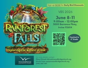 We’re thrilled to announce that Rainforest Falls is coming to Woodbridge Community Church! Our team is busy preparing an exciting Vacation Bible School where kids will dive into the wonders of God’s creation and explore the nature of God in a fun, adventurous rainforest setting.