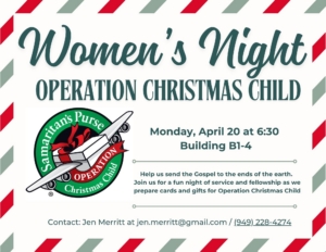 The Women’s Ministry is inviting you to join in as we prepare cards and gifts for Operation Christmas Child.